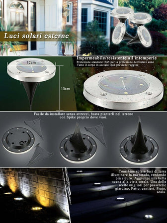 Tramite queste lampade solari potete abbellire il vostro giardino con delle eleganti segna passo a led. Hanno 4 led ciascuna e si accendono automaticamente appena fa buio. Si incastrano bene nel terreno ed una volta premuto il tasto di accensione...al resto pensano tutto loro!