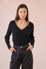 Maglione lavorato a maglia fine -Maniche lunghe -Vestibilità aderente -Scollo a V evidenziato da una fascia in tessuto iridescente -Lunghezza dalla spalla 60 cm per la taglia S