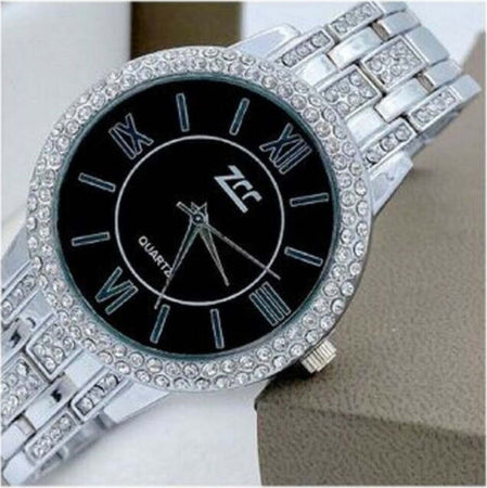 Orologio Da Polso Zcc 13 Donna Moda Quarzo Acciaio Brillantini Silver Fondo Nero