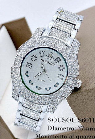 Orologio Polso Sousou S6011 Quarzo Acciaio Moda Brillantini Silver Fondo Silver