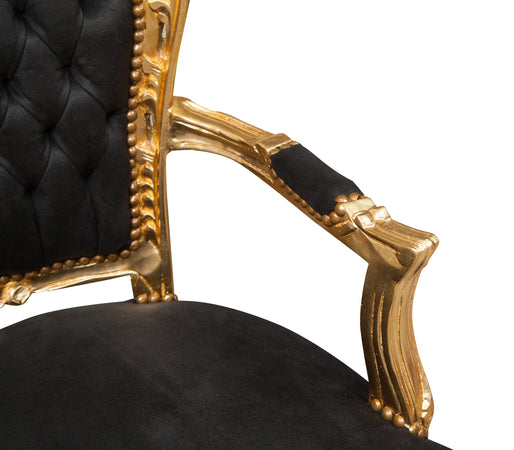 Poltrona stile francese Luigi XVI, in legno massello di faggio, intagliata e finita a mano con patina in foglia oro di dimensioni larghezza 60 cm, profondità 60 cm, altezza 107 cm. Seduta e schienale imbottiti artigianalmente.