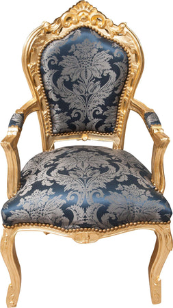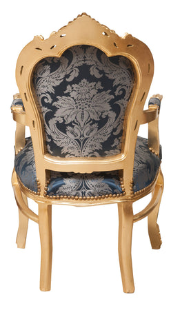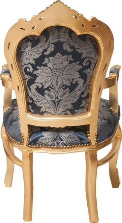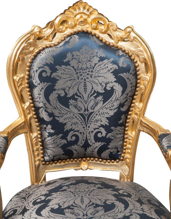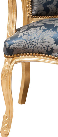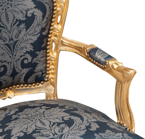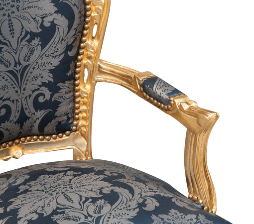 Poltrona stile francese Luigi XVI, in legno massello di faggio, intagliata e finita a mano con patina in foglia oro di dimensioni larghezza 60 cm, profondità 60 cm, altezza 107 cm. Seduta e schienale imbottiti artigianalmente.