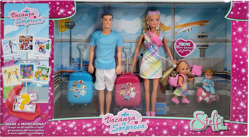 Steffi Love Vacanza a Sorpresa Simba. Steffi e la sua famiglia sono pronti per partire per le vacanze. Ma dove andranno? Tutto e' pronto! Steffi e Kevin hanno 2 grandi trolley e i bambini un allegro trolley cavalcabile. Ma sceglieranno il mare o la montagna? e' una sorpresa!