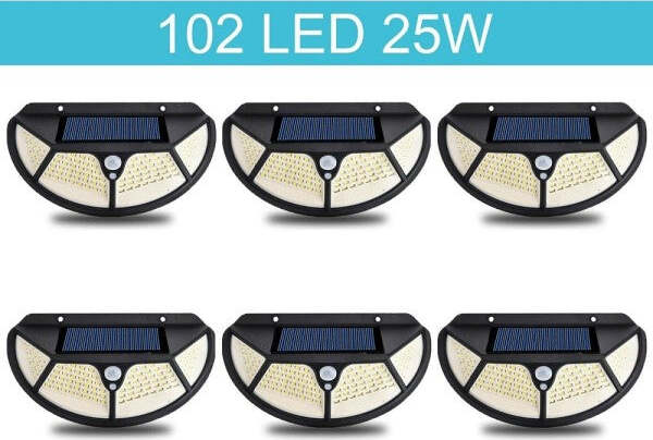 Nuovissimo modello di faretto ad energia solare, indicato per illuminazione da esterno, come giardino, porta ingresso, garage. Illuminazione automatica. Si accendono automaticamente di notte o al buio quando viene rilevato un movimento umano con un ampio angolo di movimento di 120 gradi. Angolo di illuminazione 270 gradi. La luce si spegne automaticamente circa 30 secondi. Risparmio energetico: alimentato dal sole. La robusta struttura in plastica ABS garantisce la durata più lunga. Dotato di ben 102 led SMD. Dimensioni: 15x8,6x4,8cm circa. Possibilità di istallarlo direttamente a muro mediante Fischer e vite in confezione. Non necessita di alimentazione domestica, ma si alimenta solo grazie all'energia solare del giorno, quindi si consiglia di applicarlo in zone dove durante le ore diurne il pannello solare è libero di ricevere i raggi solari per la ricarica. Resistente alla pioggia.