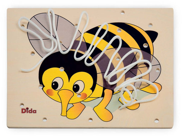 È quasi in bicromia, con prevalenza di colori giallo e nero, la tavola di allacciatura Ape per bambini in età prescolare. Mamme ed educatori, se pensate che i troppi colori possano distrarre il bambino più piccolo, scegliete tra le allacciature Dida questo modello che, per il resto, mantiene inalterate le sue caratteristiche didattiche
