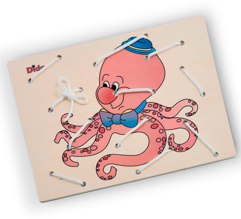 Il telaio allacciatura Polpo è un esercizio didattico che richiede concentrazione e pazienza. Per un bambino, imparare a far passare il filo dai buchi è un'attività non banale. Bisogna guardare bene il foro, riflettere sulla posizione del filo e infine dare al movimento di mano e dita la direzione giusta per prendere la mira e centrare l'obiettivo. Questo lavoro di precisione implica lo sviluppo di una motricità fine evoluta. Per i piccoli di età prescolare, l'intelligenza motoria che fa capo a questa abilità è una conquista.