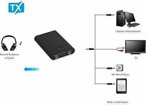 Adattatore portatile e ricaricabile da utilizzare come trasmettitore o ricevitore. La trasmissione dei dati a bassa latenza consentirà ai tuoi film, giochi e programmi TV preferiti di non avere ritardi e allo stesso tempo potrai goderti la qualità del suono stereo HD. Utilizzato per tutti i dispositivi di interfaccia audio come TV, PC, lettore CD, iPad, iPhone, ecc. Facile da connettere in Bluetooth per trasmettere l'audio a dispositivi con interfaccia audio. Sono inclusi cavi RCA e AUX da 3,5 mm per dispositivi senza funzione Bluetooth.