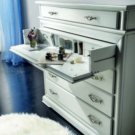 Mobili 2g - comò 5 cassetti con ribalta laccato bianco opaco leggermente consumato misure l.127 p.52 h.117 (3004)