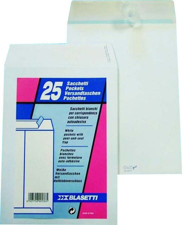Buste a sacco bianche con strip senza finestra, internografate da 100gr con strip adesivo. Formato Interno 30X40Cm cf.25