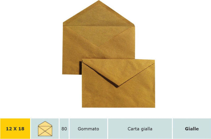Buste con chiusura gommata per una apertura facilitata. Busta in carta giallo posta da grammatura 80/mq sagoma a punta lembo gommato misura 12x18 cf 40