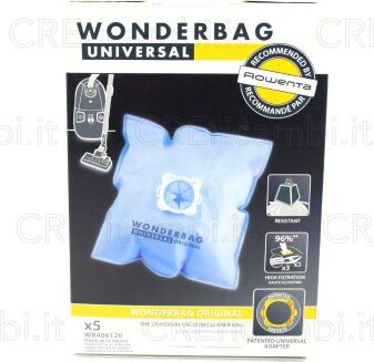 Confezione da 5 sacchetti universali per aspirazione ROWENTA. In microfibra WONDERBAG Original  è più resistente  di un sacchetto di carta ed è meno soggetto a strappi e scoppi.