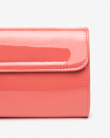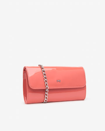 Pochette donna in vernice Nero Giardini con pratica chiusura bottone-calamita. Comodo scomparto interno con tasche di servizio. Dotata anche di una pratica tracolla removibile in catena. 19x10x6