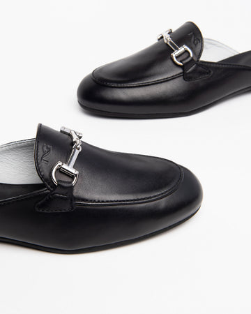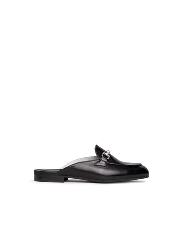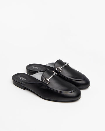 Sabot donna in pelle Nero Giardini con morsetto. Interno in pelle, sottopiede con cuscinetto su fondo gomma con tacco a blocco 1 cm. Made in Italy.