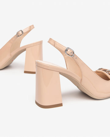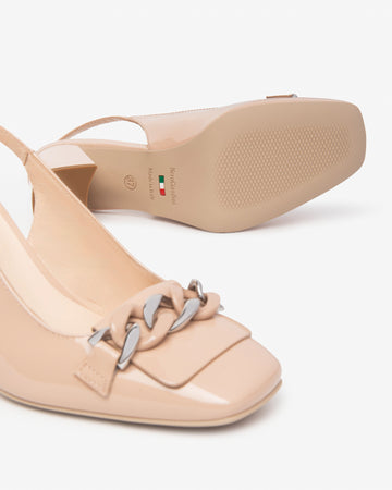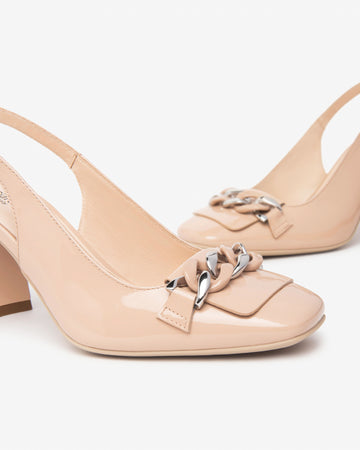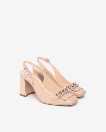 Slingback in vernice con accessorio Nero Giardini. Chiusura con fibbia, interno in pelle, fondo gomma e tacco a blocco 8 cm. Made in Italy.