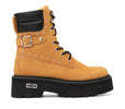Combat boot in pelle nera liscia, con suola massiccia e dettagli metallici. Una silhouette solida, ispirata al mondo militare, ma reinterpretata in chiave urbana. Decisa, essenziale, senza compromessi.