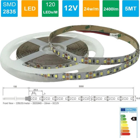 Strip Led Striscia 600 Leds/m 12v 24w/m Lunghezza 5 Mt 2400 Lumen Senza Guaina
