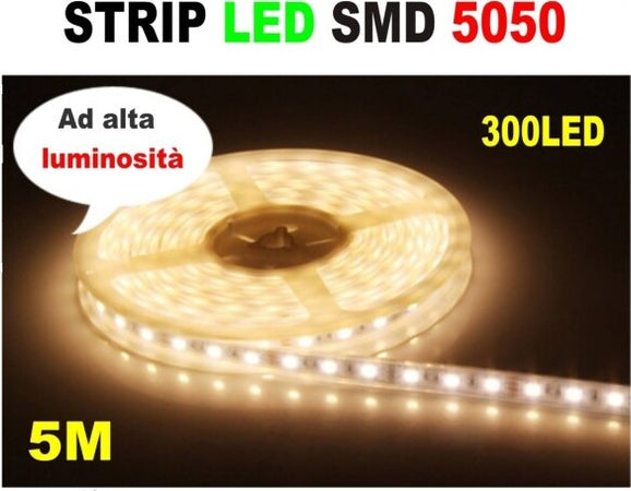 Striscia Strip Led Resistente All'acqua - 5 Metri - Smd5050 Bianco Caldo - 300 L