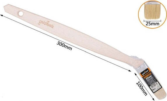 Pennello angolato per facilitare la pitturazione dietro radiatori, tubi e altre zone difficili da raggiungere. Con ghiera in acciaio. Manico in legno lungo 30 cm con setole bionde.