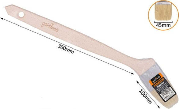 Pennello angolato per facilitare la pitturazione dietro radiatori, tubi e altre zone difficili da raggiungere. Con ghiera in acciaio. Manico in legno lungo 30 cm con setole bionde.