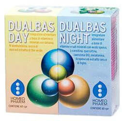 Integratore alimentare con formule Day&Night studiate per favorire il riequilibrio del sistema neurovegetativo. Dualbas Day sostiene il sistema ortosimpatico durante la mattina. Dualbas Night incrementa il tono del sistema parasimpatico durante la notte. Dualbas Day&Night svolge un’azione alcalinizzante, ricostituente e antiossidante. Dualbas Day&Night è utile in caso di astenia psicofisica, calo di vitalità, affaticamento cronico, disturbi della funzionalità intestinale e del microcircolo, surmenage lavorativo e sportivo, diminuzione delle difese immunitarie, disturbi del sonno e del tono d’umore.