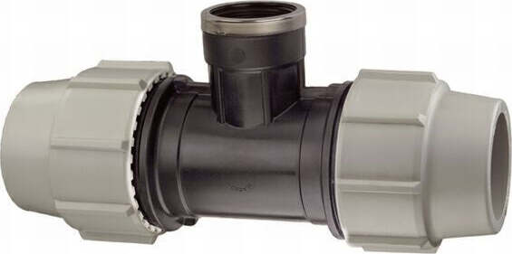 Tee filettata a compressione per tubo in polietilene nero. Misura: 50X1/1/2X50