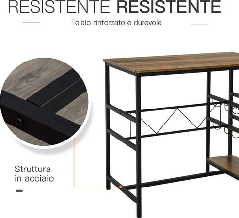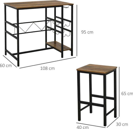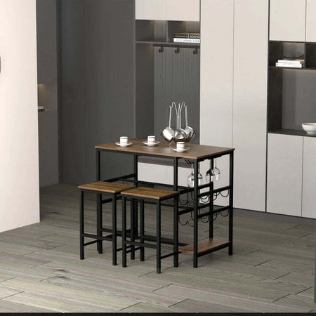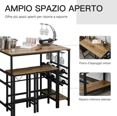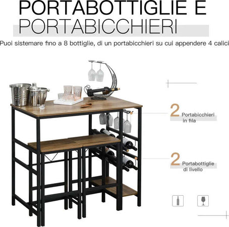 Set Tavolo 2 Sgabelli Alti da Bar in Legno Isola Cucina con Portabottiglie e Portabicchieri in Stile Industriale GT5835-215GT5