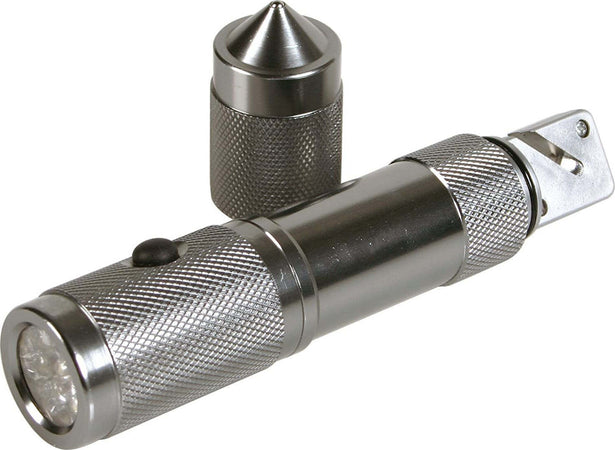Utensile salva-vita in lega di alluminio: torcia a LED, punta frangivetro e lama taglia-cintura di sicurezza; completo di custodia