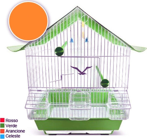 Gabbia per uccelli forma Tetto. Realizzata in metallo con fondo in plastica e manico in metallo. E' adatta a canarini, pappagallini, esotici e altri uccelli. Completa di accessori: posatoi, altalena e mangiatoie. Il gancio in cima alla gabbia consente di spostarla e appenderla facilmente. Dotata di porticina frontale per un facile accesso e, inoltre, è dotata di fondo in griglia per permetterne la pulizia. Disponibile in diversi colori (inviati in base alla disponibilità in magazzino).