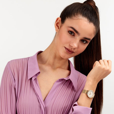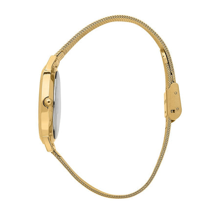 Il cinturino in maglia milanese color oro garantisce una calzata confortevole ed elegante, completata da una pratica chiusura clip & gancio. Il movimento al quarzo solo tempo assicura precisione, mentre il vetro minerale protegge il quadrante.