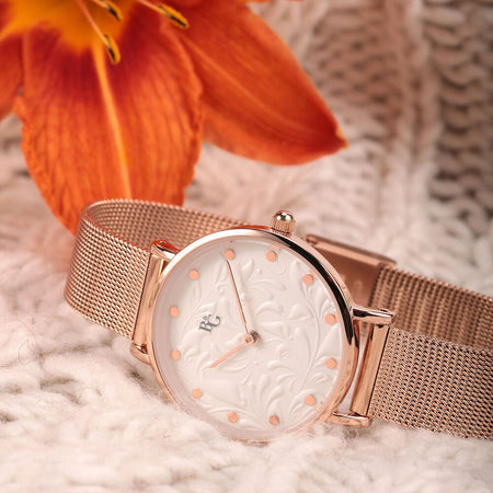 Il quadrante chiaro con delicato motivo floreale è protetto da vetro minerale, mentre la chiusura clip and hookgarantisce una perfetta aderenza al polso. Il movimento al quarzo assicura precisione quotidiana.