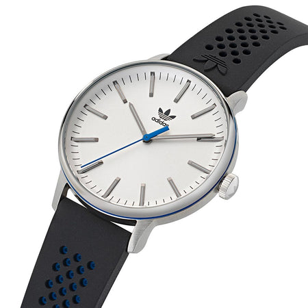 Orologio ADIDAS unisex collezione CODE ONE con cinturino in gomma nero, cassa in acciaio 38 mm, quadrante bianco. Movimento al quarzo. Resistenza all'acqua 50 metri