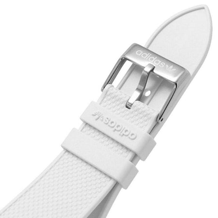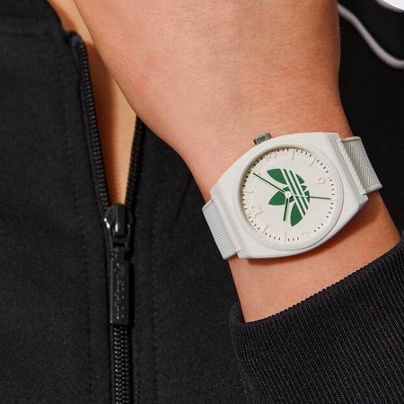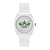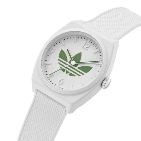 Orologio ADIDAS unisex collezione PROJECT TWO con cinturino in gomma bianco, cassa in policarbonato bianco 38 mm, quadrante bianco con logo verde. Movimento al quarzo. Resistenza all'acqua 50 metri