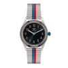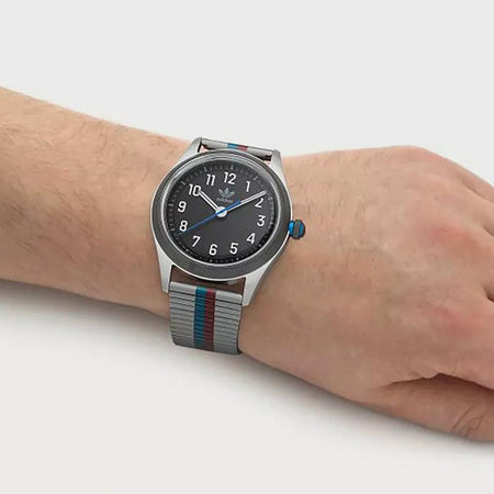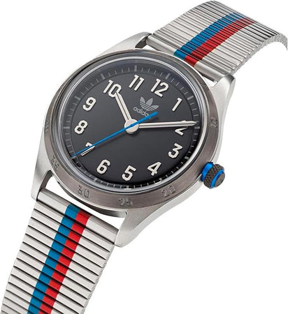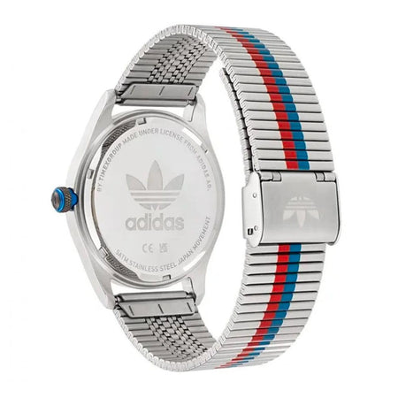 Orologio ADIDAS uomo collezione CODE FOUR con bracciale in acciaio con inserto rosso e blu, cassa in acciaio 42 mm, quadrante nero. Movimento al quarzo. Resistenza all'acqua 50 metri