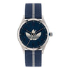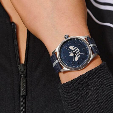 Orologio ADIDAS da uomo collezione CODE FOUR con cinturino in tessuto blu e grigio, cassa in acciaio 42 mm, quadrante blu con logo grigio. Movimento al quarzo. Resistenza all'acqua 50 metri