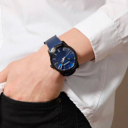 Orologio Calvin Klein da uomo collezione 'Authentic' realizzato con cinturino in gomma blu, cassa in acciaio nero 40 mm, quadrante blu con datario. Movimento al quarzo Swiss made.