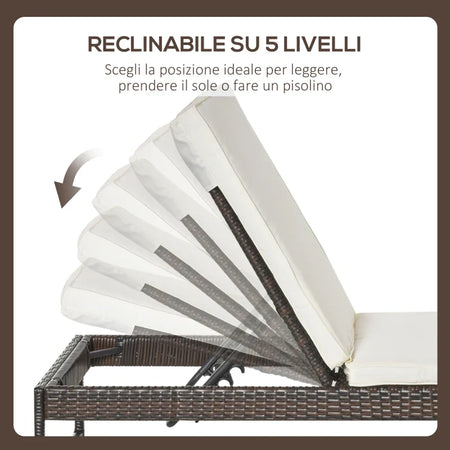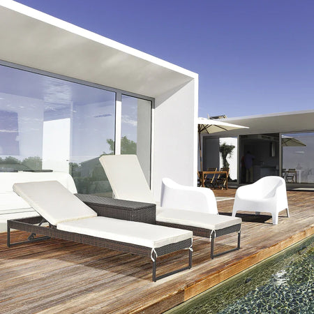 3pz Componibile 2 Lettino Prendisole da Giardino (60 x 195 x 86cm) e 1 Tavolino (121 x 40 x 50cm) Rattan con Materassini, Marrone e Bianco Crema 862-022BN