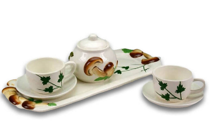 6 pezzi Set da Caffè funghi in ceramica dipinto a mano con vassoio + 2 tazzine caffè + 2 piattini + zuccheriera G Casa