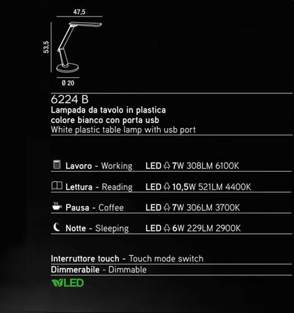 Abat-jour moderna Perenz MOOD 6224 B LED USB lampada tavolo scrivania dimmerabile touch bianca IP20