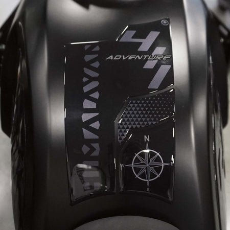 Protezione serbatoio Moto realizzato in resina gel 3D su materiale metallizzato. Paraserbatoio moto con grafica base nera e scritta Adventure effetto argento metallizzato.