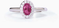 Anello da donna in argento rodiato con rubino sintetico ovale e zirconi bianchi.