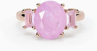 Anello regolabile da donna in argento placcato oro rosa 18K con fusion stone di glass rosa e cristallo di rocca taglio ovale, e glass rosa taglio baguette.