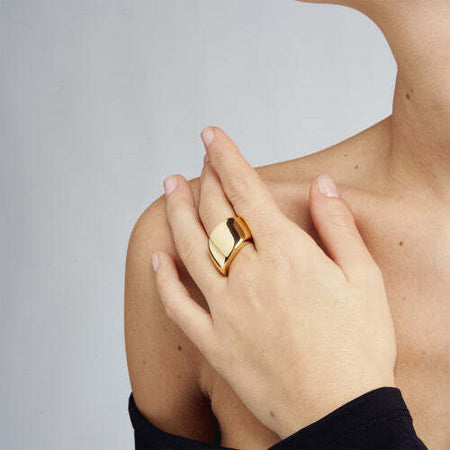 Anello aperto a fascia bombata in bronzo con bagno in oro 24kt. Un accessorio dalla visibilità importante e dalle linee scultoree perfetta sintesi dell'idea di gioiello contemporaneo secondo UNOAERRE. Completano il look gli orecchini Onda coordinati.