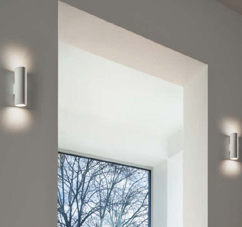 Applique in gesso bianco a forma cilindrica a due luci con attacco GU10 LED