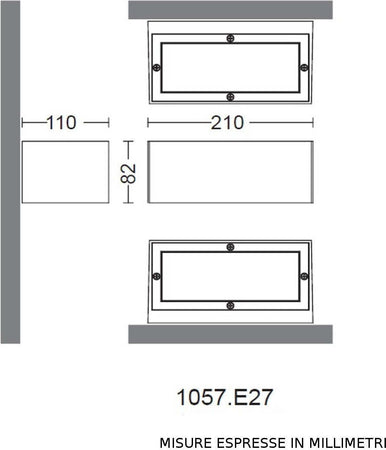 L'applique ha una forma rettangolare  semplice ma efficiente al tempo stesso, un modello moderno con una luce biemissione (rivolta verso l'alto e verso il basso), adatto all'istallazione di pareti esterne come porticati, finestre, balconi, terrazzi, ecc..., misura una lunghezza di 21 centimetri, un'altezza di 8.2 centimetri ed una sporgenza di 11 centimetri.