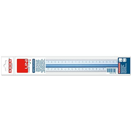 Riga Uni 30cm in plastica del brand Arda. Graduazione incisa a caldo dei centimetri e dei millimetri con caratteri facilmente leggibili e molto precisi per garantire la massima professionalita'. Bordo tirachina sul lato non graduato. In busta self-service. Materiale termoresistente. Tipologia prodotto: Righelli. Materiale: Plastica. Colore: Trasparente. Massima trasparenza.