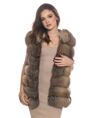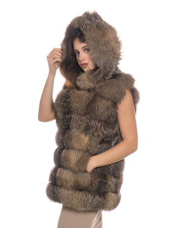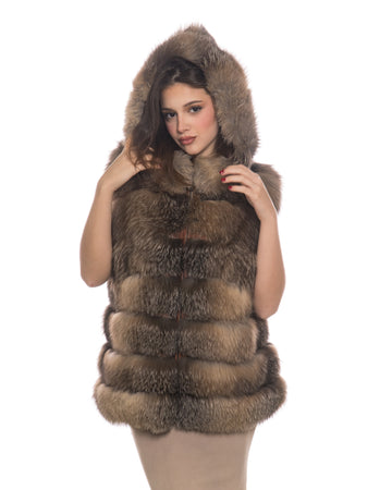 Arianna - Smanicato Donna Beige in vera pelliccia di volpe con cappuccio