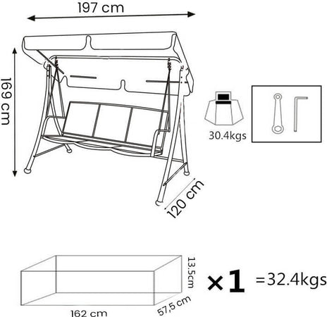 Il dondolo da giardino Auris è realizzato in acciaio verniciato color bianco, la seduta è in textilene e il telo è di poliestere.