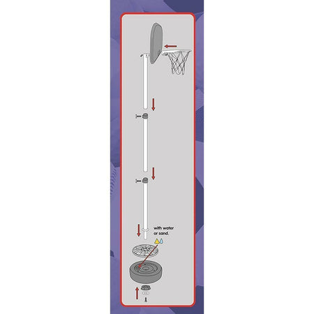 Canestro con asta regolabile può raggiungere fino ai 120 cm di altezza, la base rotonda a forma di ruota può essere riempita con sabbia o con acqua garantendo un eccellente stabilità del canestro.