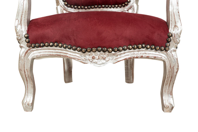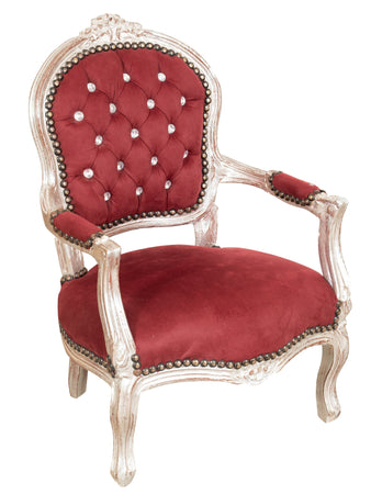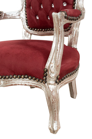 Sedia da bambino stile francese Luigi XVI, in legno massello di faggio, intagliata a mano. Finitura foglia argento anticato di dimensioni larghezza 51 cm, profondità 50 cm, altezza 73 cm. Seduta e schienale imbottiti artigianalmente in ecopelle.