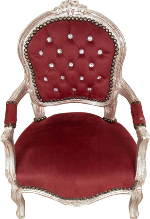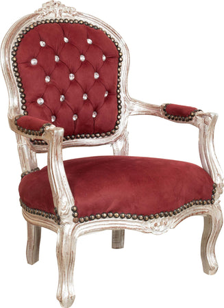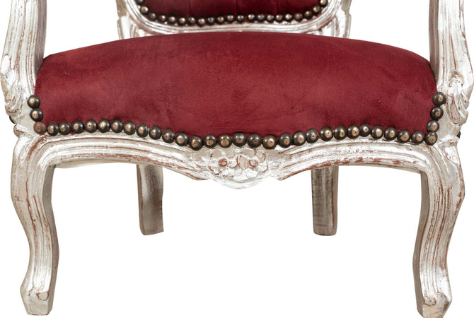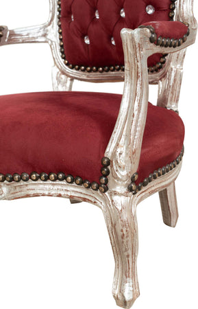 Sedia da bambino stile francese Luigi XVI, in legno massello di faggio, intagliata a mano. Finitura foglia argento anticato di dimensioni larghezza 51 cm, profondità 50 cm, altezza 73 cm. Seduta e schienale imbottiti artigianalmente in ecopelle.